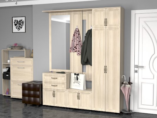 Удобная и гармоничная вешалка для одежды, помимо крючков имеется полка для головных уборов.